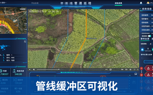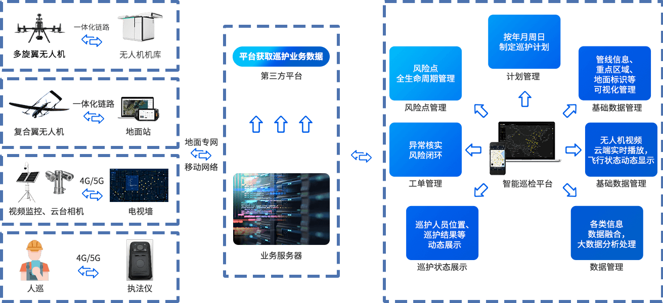 整体解决方案以“无人机+巡检平台”为核心,搭载各类任务载荷实现管道全自主巡检,并以机动无人机组为核心进行管线巡检全面覆盖,通过将采集数据回传至巡检平台进行智能识别,并及时告警派单处理,结果数据可实时推送至调度中心智慧大屏,实现“即拍、即传、即识别、即处理”的全自主闭环巡检作业任务。